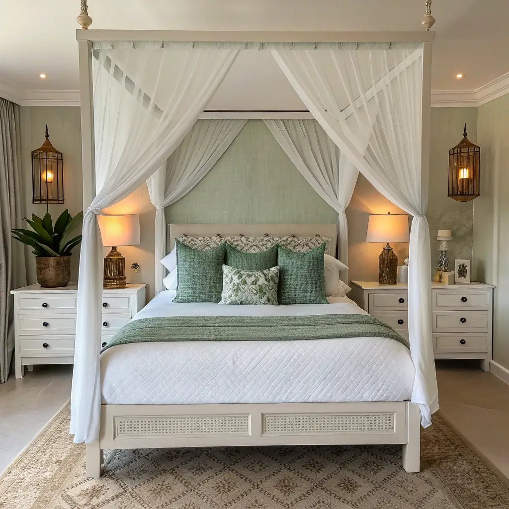 Canopy beds scream romance and luxury, but add sage green pillows to a white canopy setup? Now you’re speaking my language. This combination feels fresh and modern rather than stuffy or overdone.