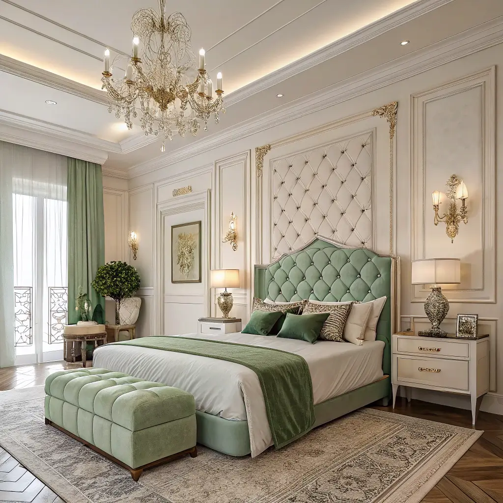12. Luxe White Bedroom with Sage Green Touches