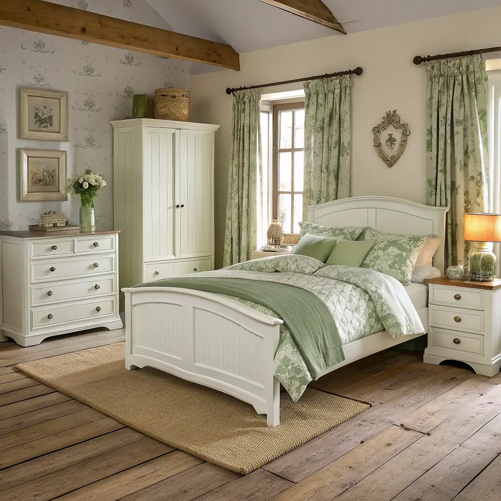 Think distressed white furniture paired with sage green accessories. A white iron bed frame looks incredible with sage pillowcases and a cozy throw draped casually at the foot. Add some mason jar lighting, woven baskets for storage, and maybe a vintage ladder repurposed as a blanket rack.