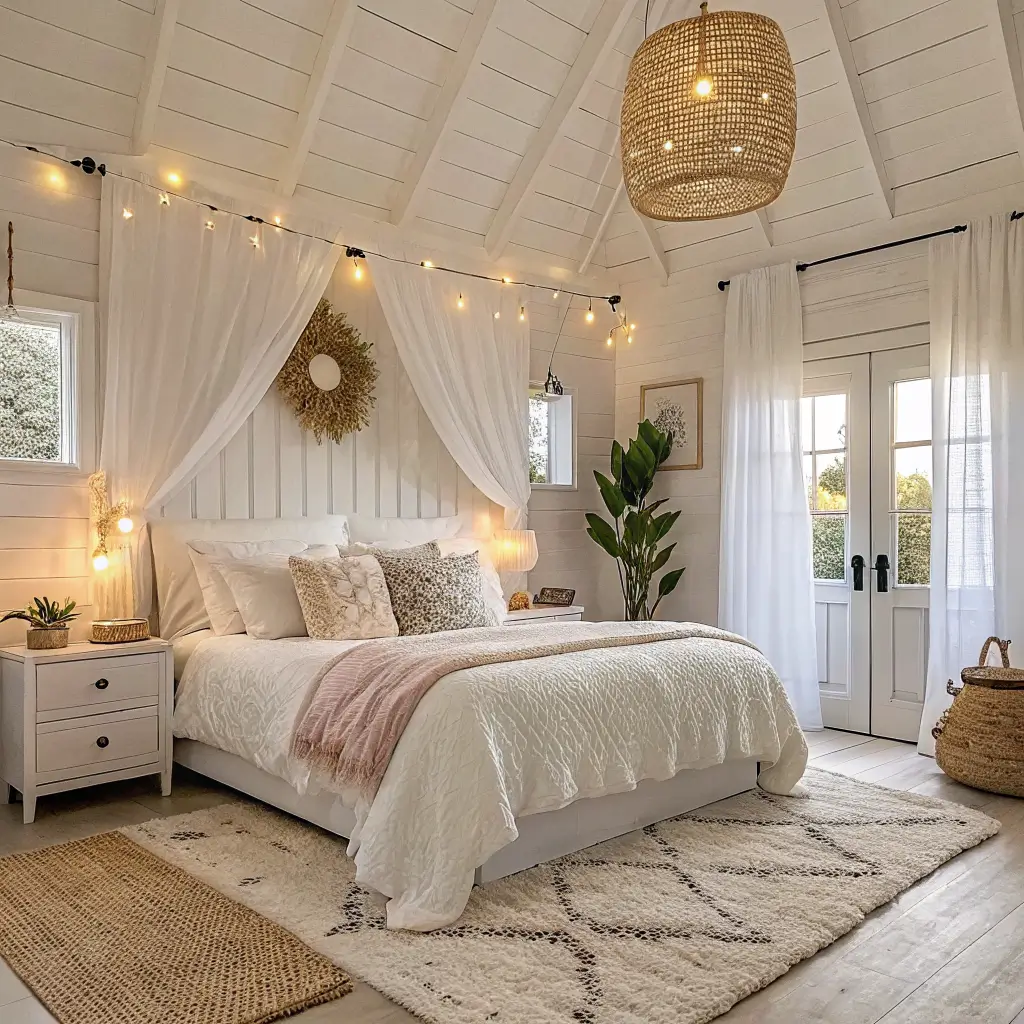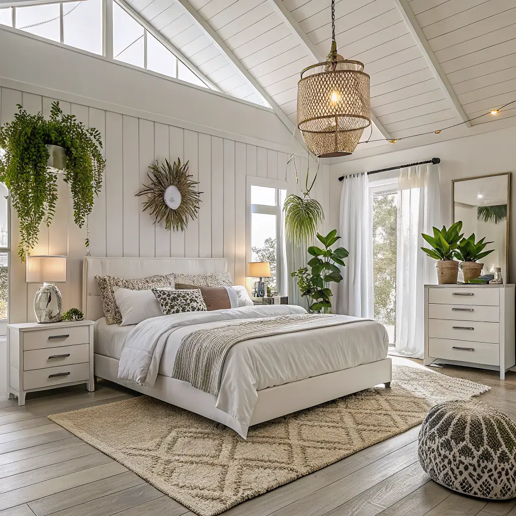 Now, if minimalism feels too cold for you, let’s talk boho white bedrooms. This style basically says, “I’m chill, I probably do yoga, and yes, I have crystals.” And honestly? I’m here for it.