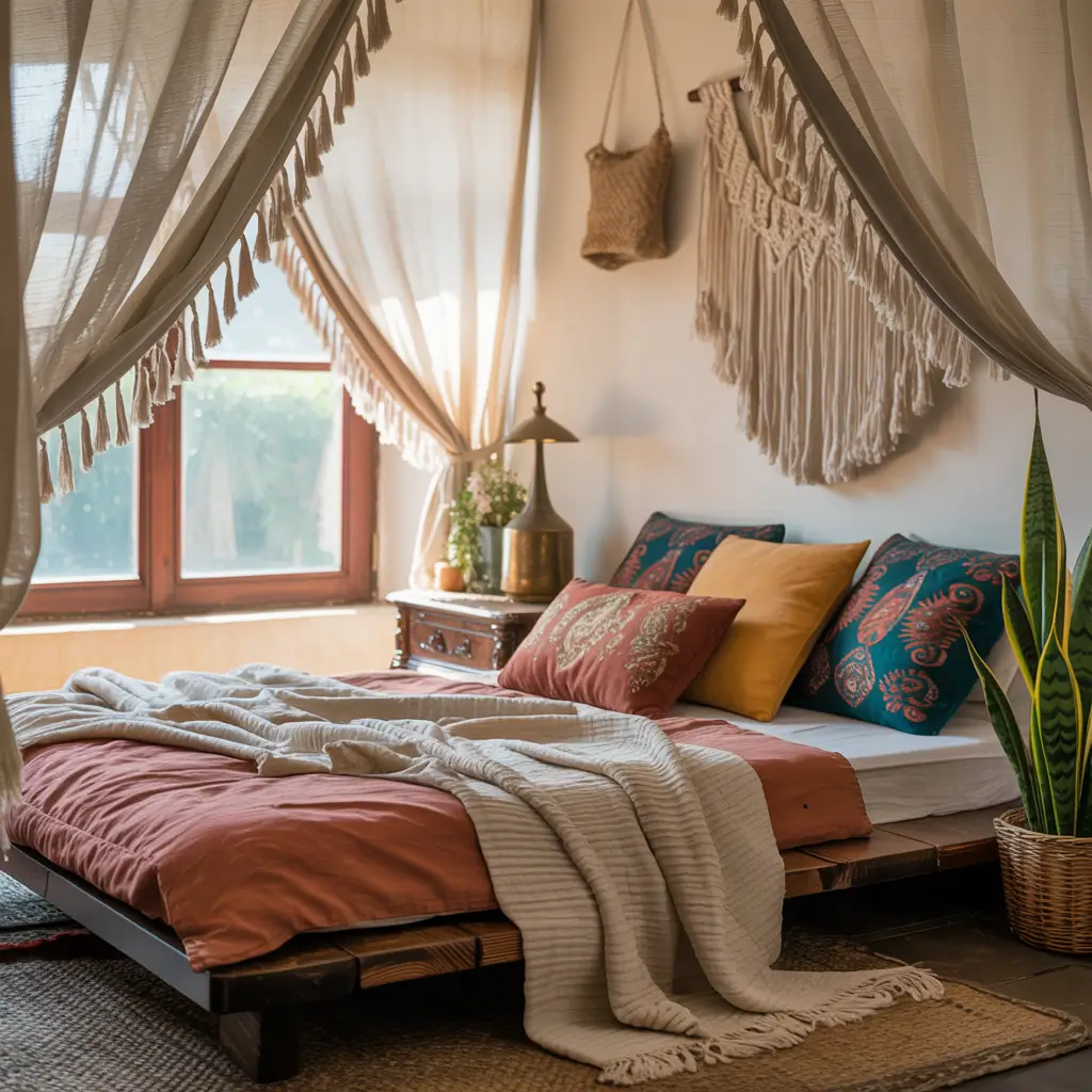 Boho bedrooms and white curtains with tassels? Match made in design heaven. These bring that free-spirited, artistic energy that makes a bedroom feel personal and unique. Plus, they’re surprisingly versatile – working with everything from macramé wall hangings to minimalist furniture.