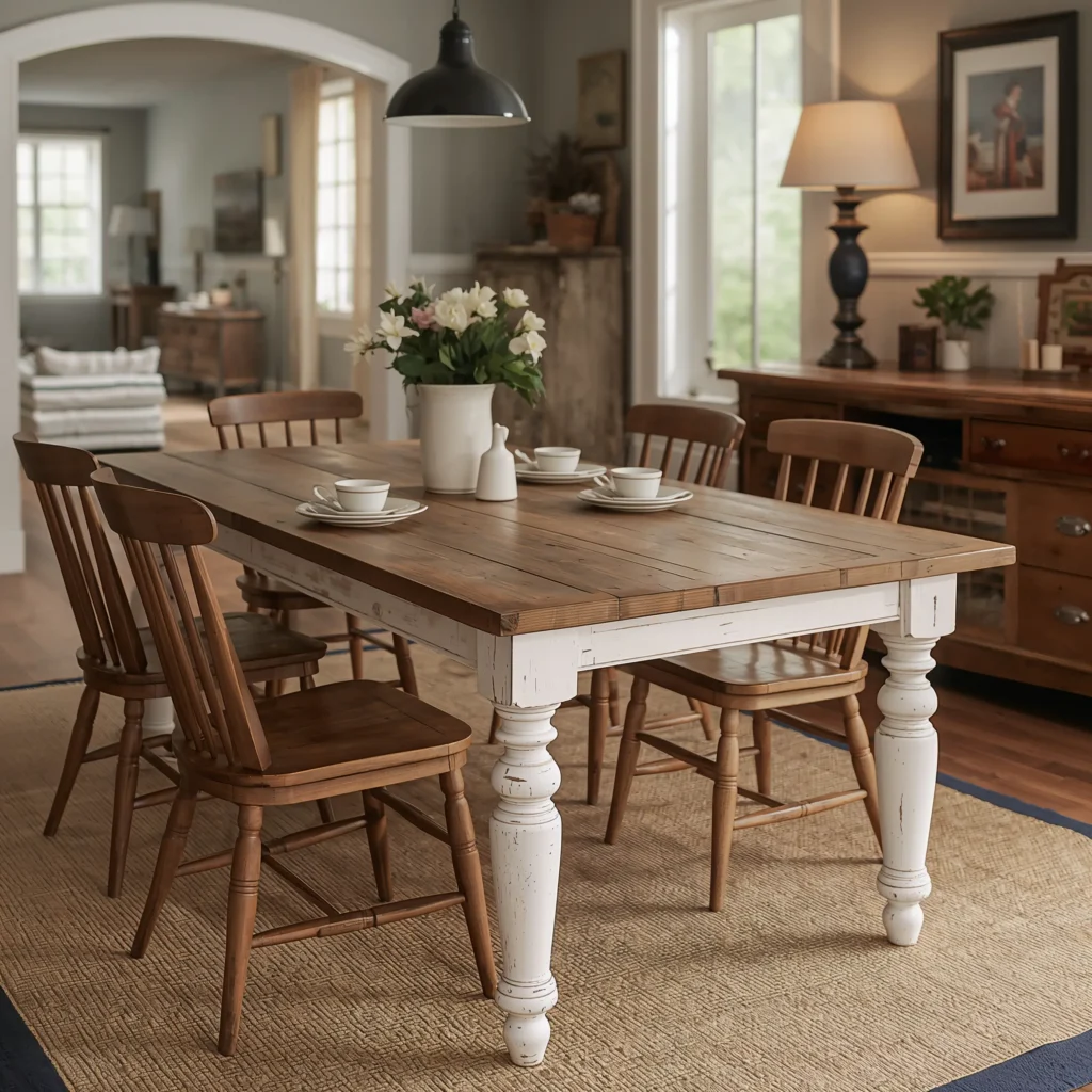 Now, if minimalism makes you yawn, let me introduce you to the rustic farmhouse white dining table â€“ basically the golden retriever of dining furniture. These tables bring warmth, character, and that “come sit and stay awhile” vibe that makes everyone feel at home.