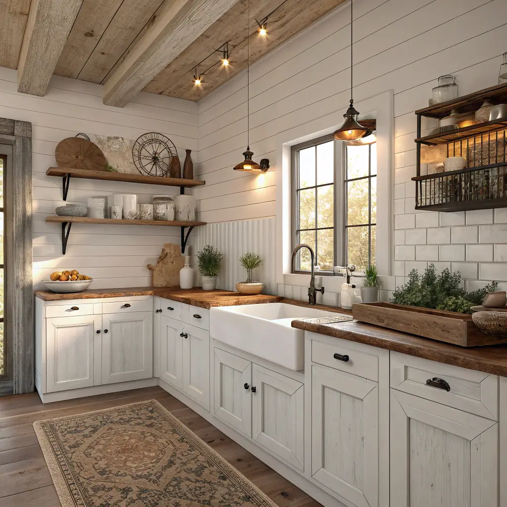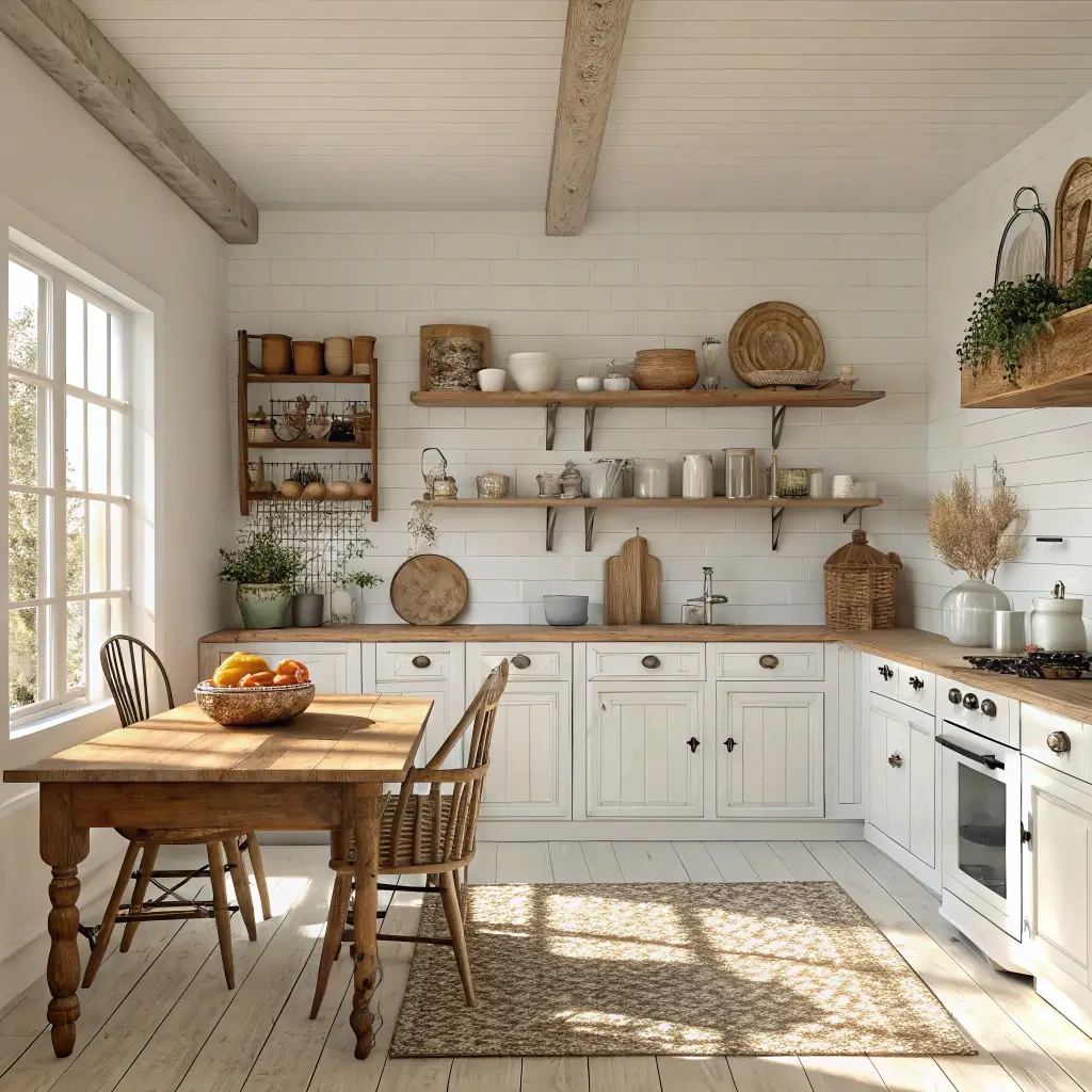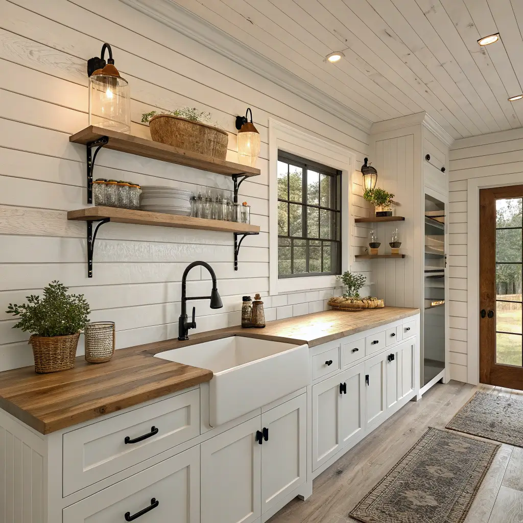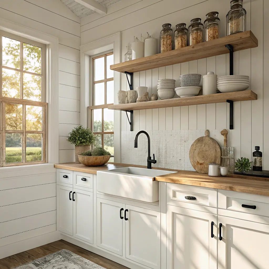 Cozy White Farmhouse Kitchen with Rustic Shelves