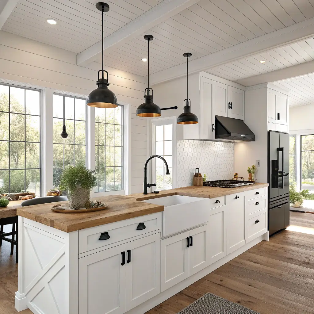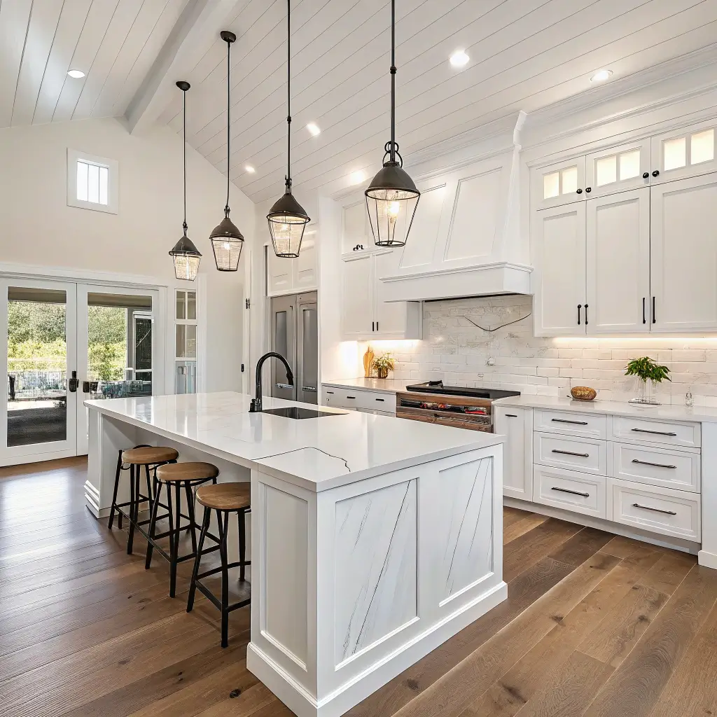 White Farmhouse Kitchen with Hanging Pendant Lights