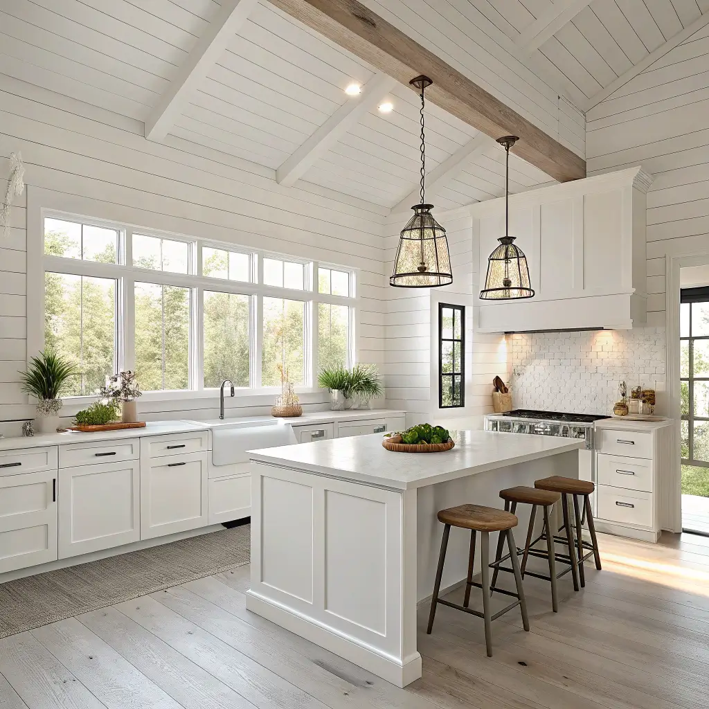 What really sells this look? Those clean lines mixed with farmhouse elements. Think sleek white cabinets paired with a farmhouse sink, modern bar stools next to shiplap details. It’s like your kitchen went to finishing school but didn’t forget its roots.
