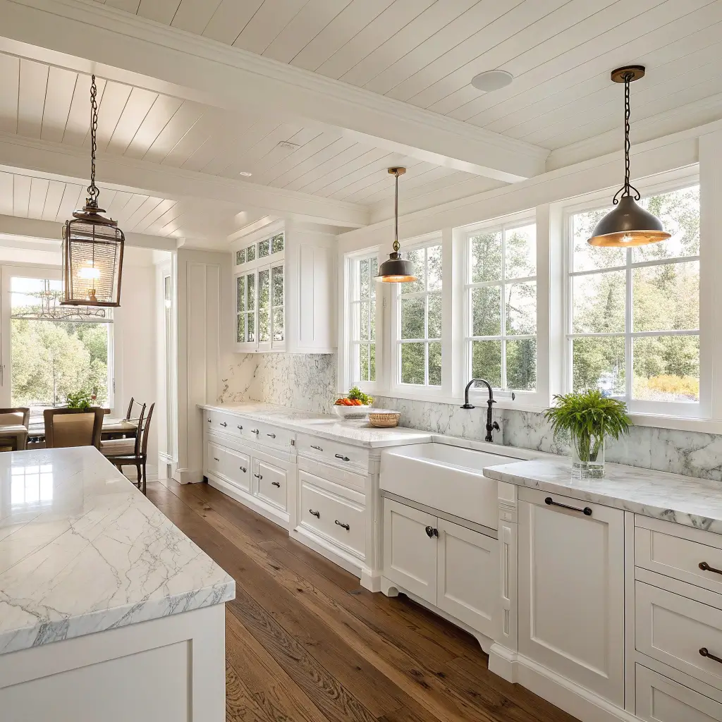 Farmhouse Kitchen with White Cabinets and Marble Countertops