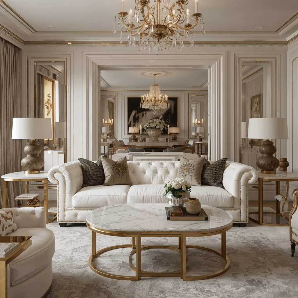 My favorite trick? Gold-framed mirrors above a white leather couch. They add glamour while serving a practical purpose.