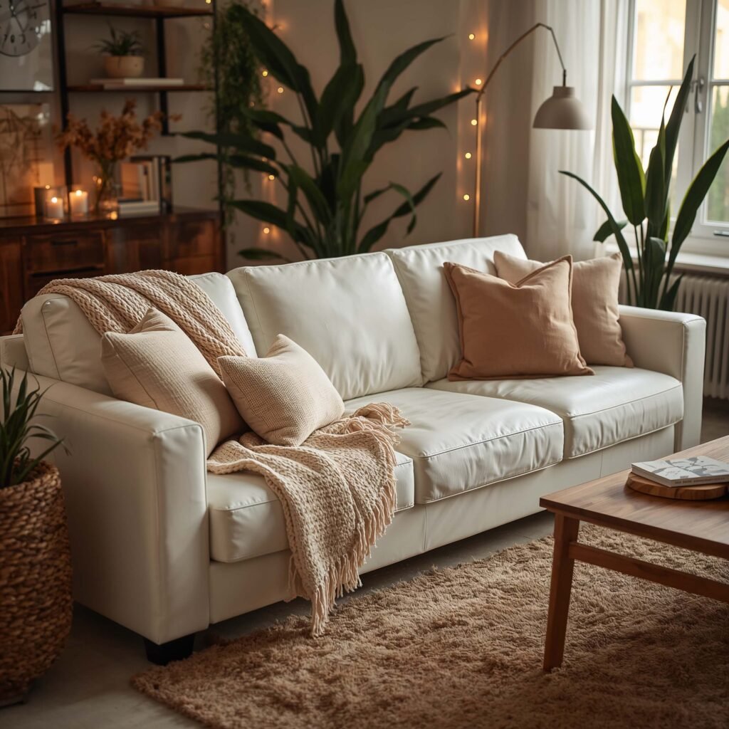 I personally love adding a single oversized plant – maybe a fiddle leaf fig or monstera. It brings life without cluttering the space. The contrast between the organic greenery and pristine white leather? Chef’s kiss.