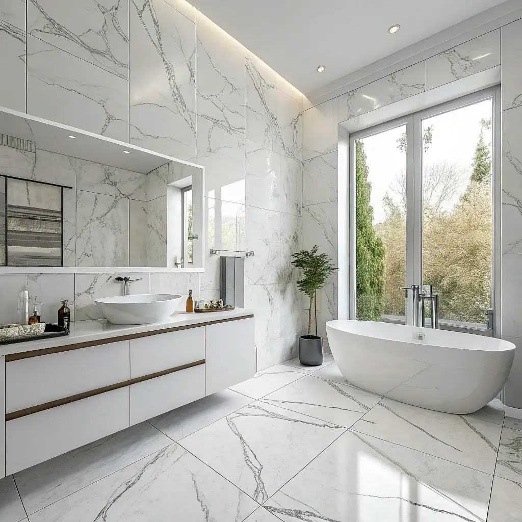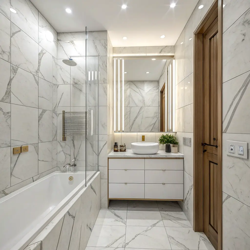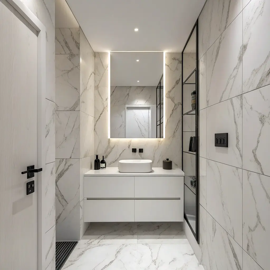 Small bathroom? No problem. White marble tiles can make your tiny space feel twice its size. The key lies in strategic placement and pattern choice.