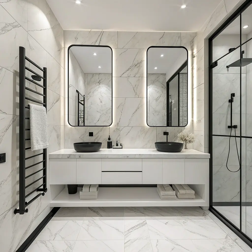 Here’s where things get interesting. Black and white – the power couple of bathroom design. Adding black accents to white marble creates this dramatic, sophisticated contrast that never fails to impress.