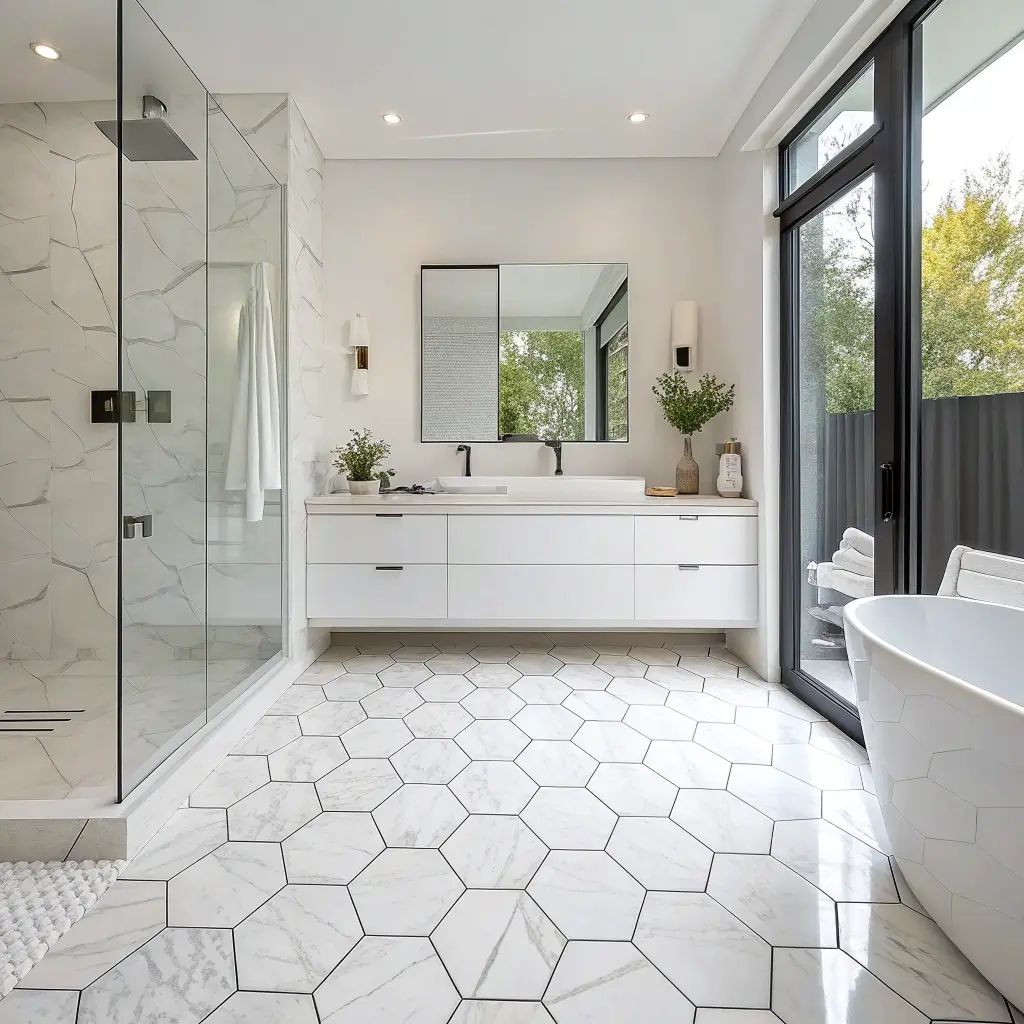 Hexagon tiles are having a moment, and when you make them in marble? Pure magic. These six-sided beauties add geometric interest while maintaining sophistication.