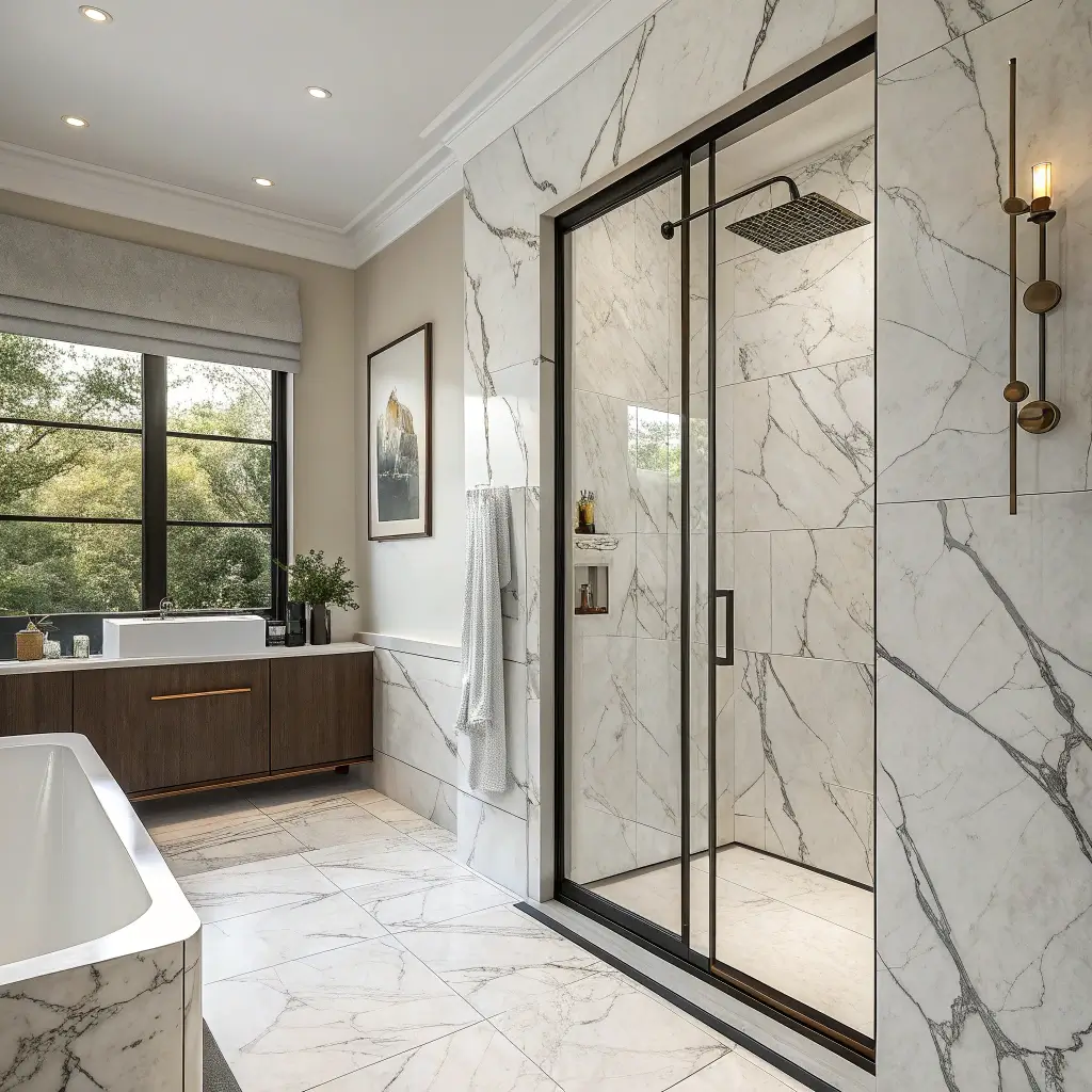 Want drama? Create a statement shower wall with book-matched marble slabs or an eye-catching pattern. This becomes your bathroom’s focal point, the thing everyone remembers.
