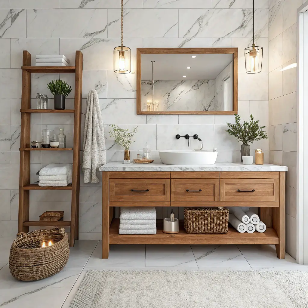 Consider a wooden vanity top with marble backsplash, or wooden mirror frames against marble walls. The natural materials complement rather than compete 🙂