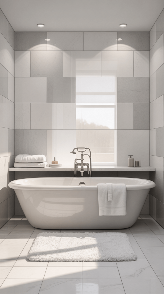 A wall of large-format glossy white tiles (think 12×24 inches or bigger) with very thin grout lines creates a seamless, almost liquid look that is the epitome of modern luxury. It feels very spa-like and high-end.