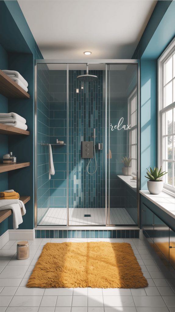- Textiles: A bold emerald green bath mat, vibrant mustard yellow towels, or a shower curtain with a fun print.
