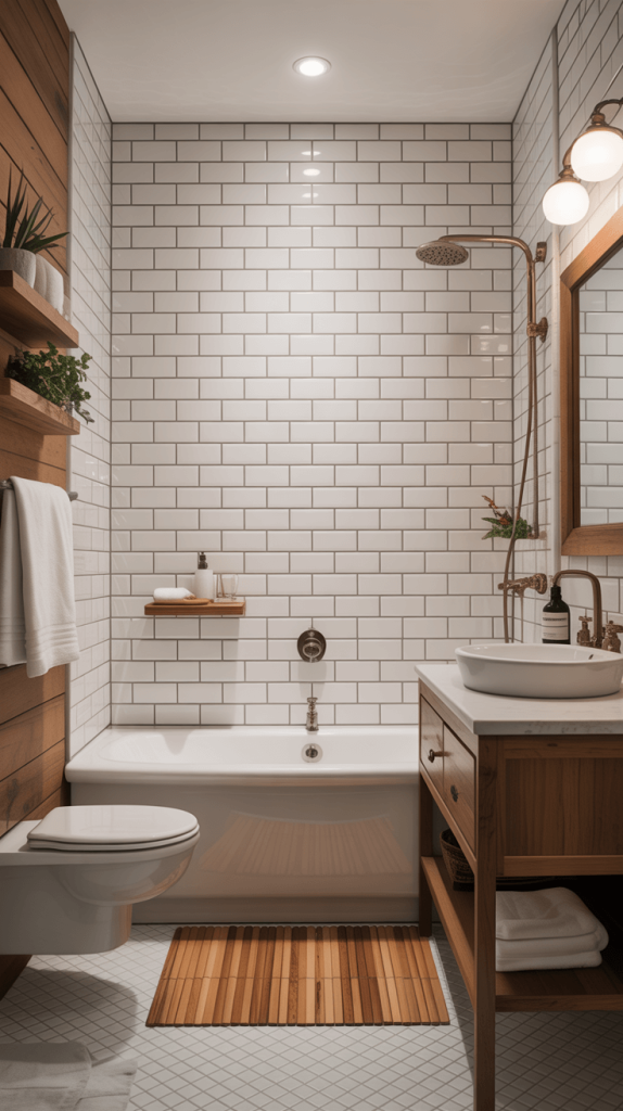 - Accent Wall: A wall of shiplap or vertical wood planks next to a tiled shower creates amazing texture.