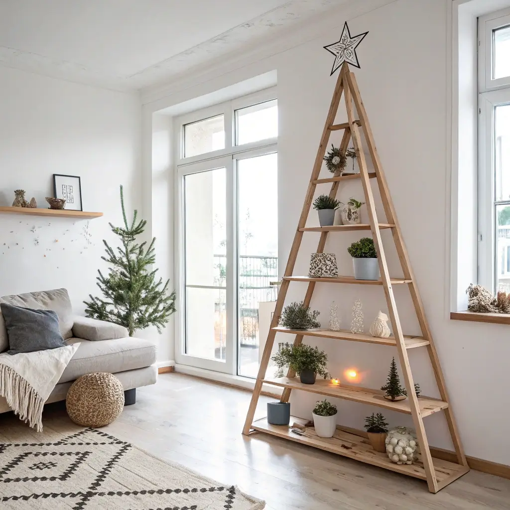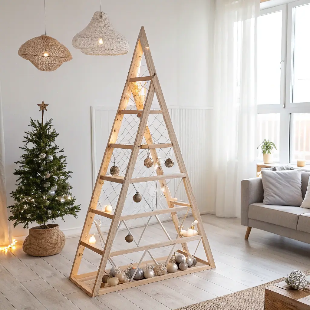 Simply lean a wooden ladder against your wall and decorate each rung. A-frame ladders work brilliantly as standalone trees, while straight ladders create stunning wall displays. I wrapped mine with warm white lights first, then draped garland loosely for that effortless look.