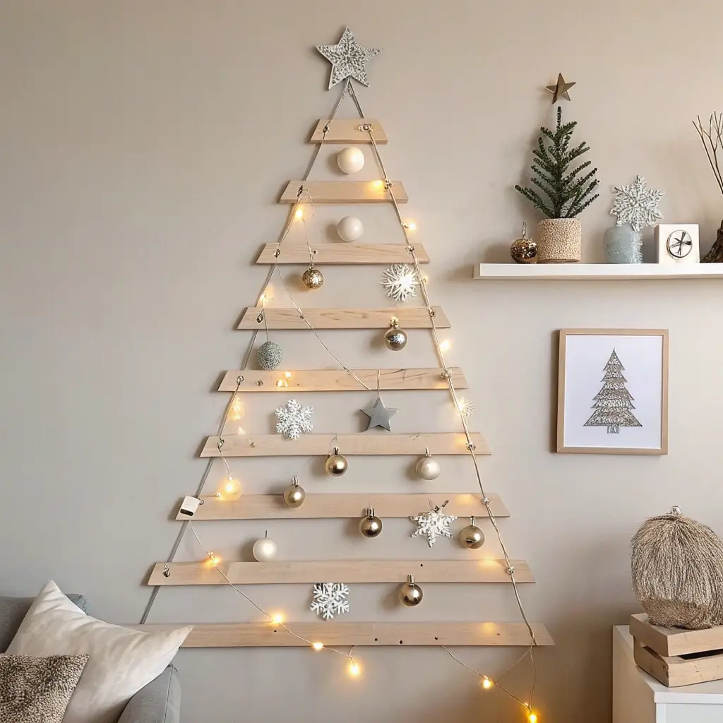 String lights along the edges, hang lightweight ornaments from small hooks, and you’ve got a tree that won’t eat up any floor space. FYI, this design photographs beautifully for those holiday card shots 🙂