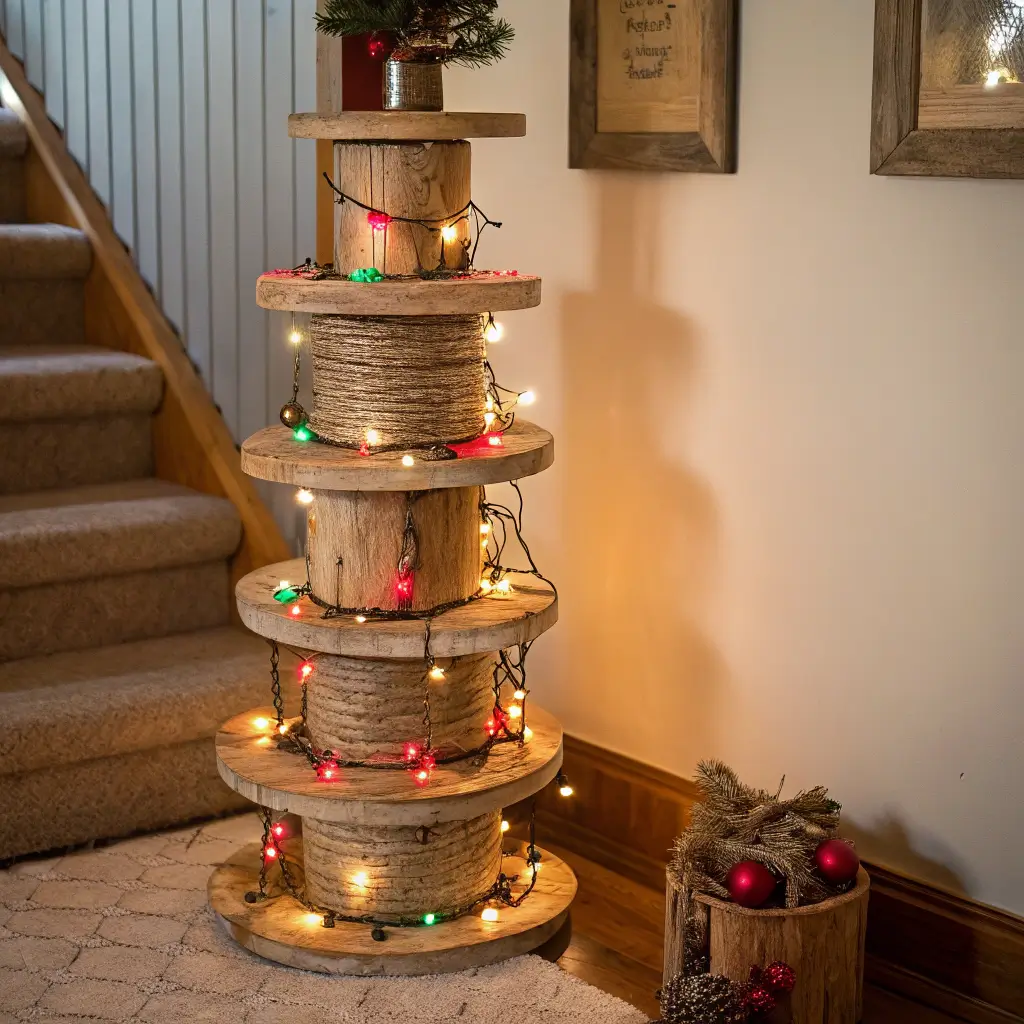Here’s where it gets fun – wrap string lights around each spool tier. The circular grooves hold lights perfectly, creating layers of illumination that look absolutely magical at night. Add some garland, maybe a few baubles, and watch your neighbors get spool-envy.
