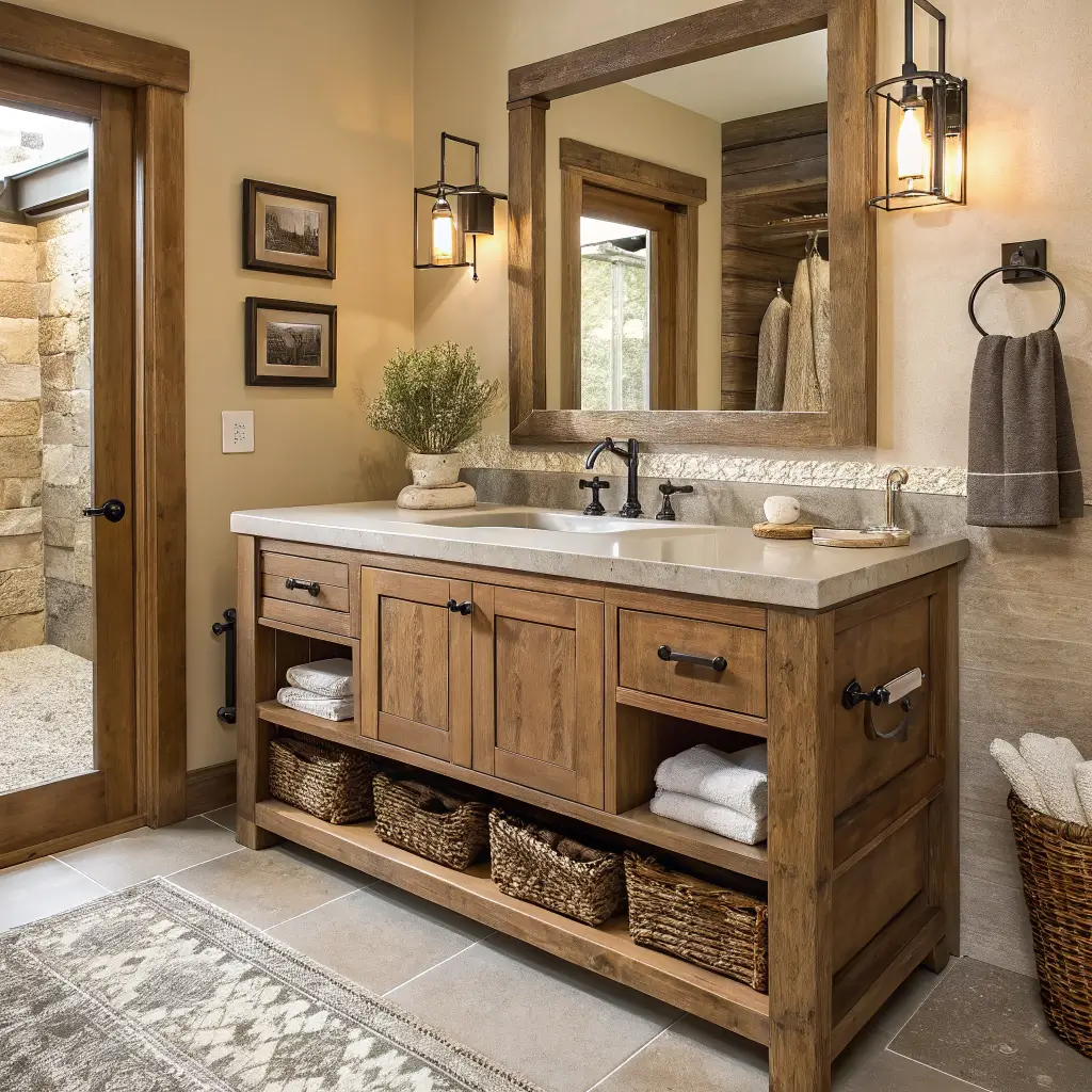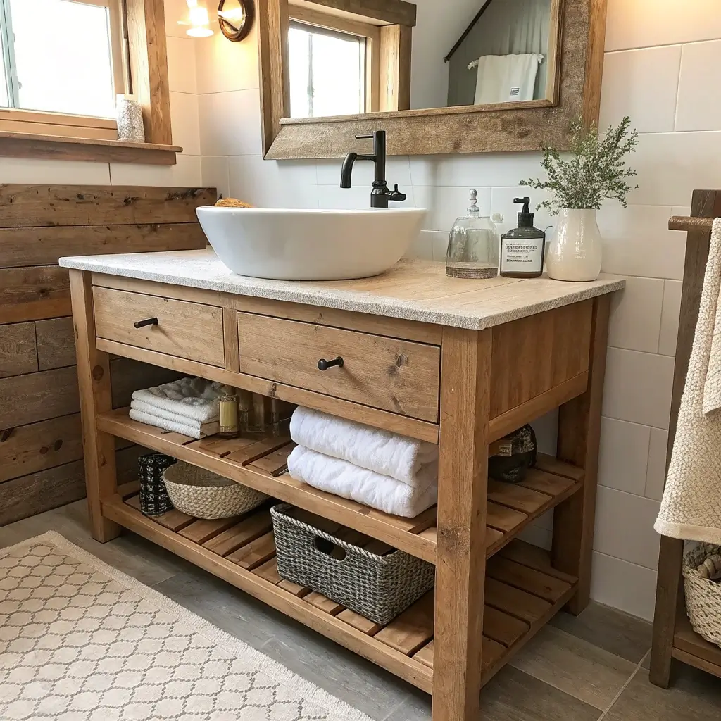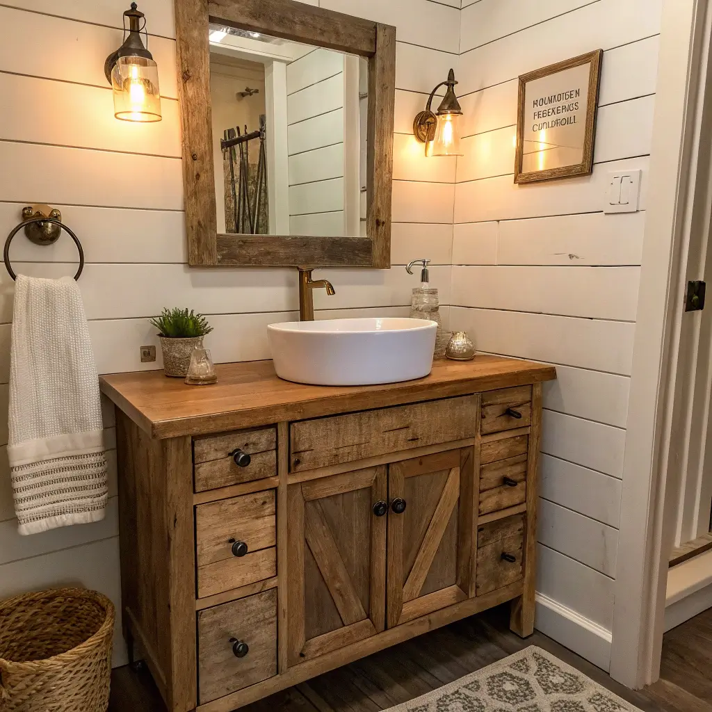 Now, if minimalism makes you yawn, let me introduce you to the rustic farmhouse vanity—basically the complete opposite. This style screams “I own chickens and make my own soap” even if you live in a city apartment.