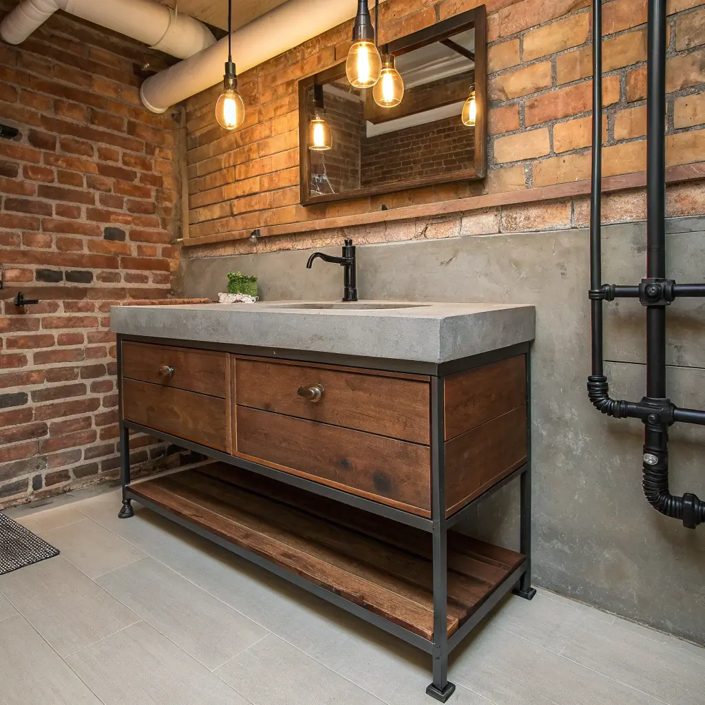 My brother’s industrial vanity features a thick reclaimed wood top sitting on black pipe legs. It looks like something you’d find in a trendy restaurant bathroom, but it’s in his suburban home. The exposed plumbing underneath actually becomes part of the aesthetic—genius, right?