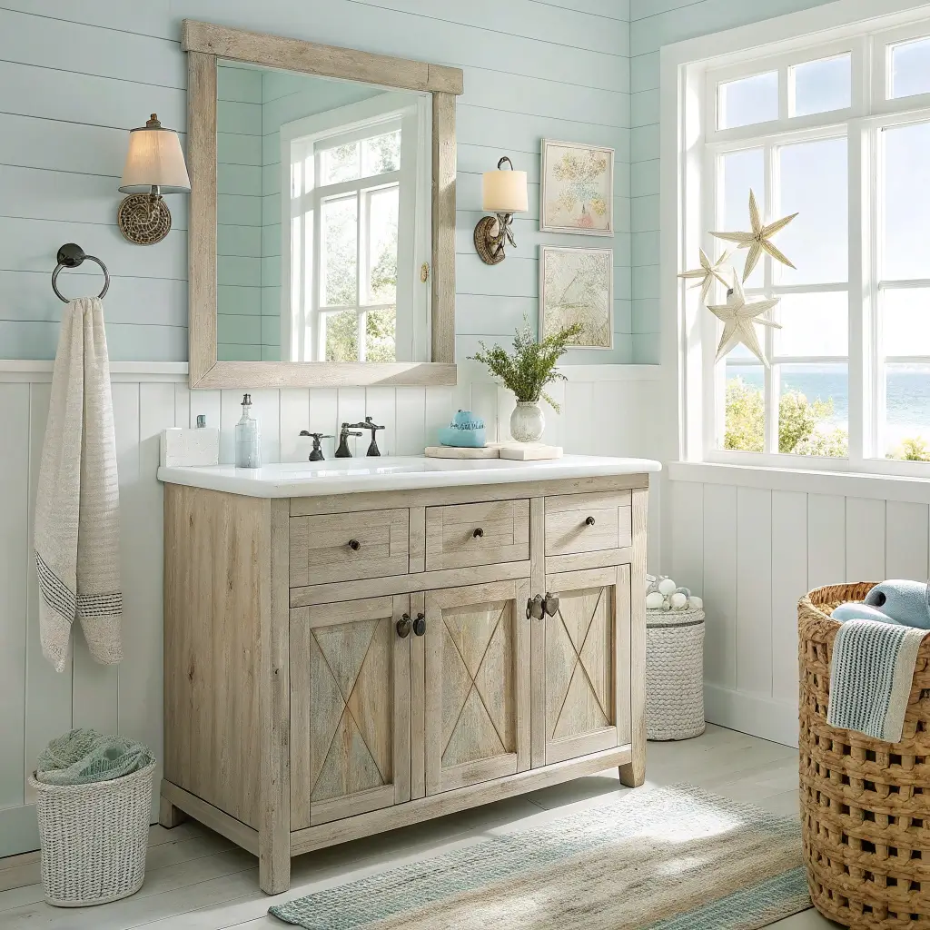 I’ve seen some incredible DIY versions where people use actual driftwood pieces to create custom vanities. But if beachcombing isn’t your thing, manufactured weathered wood gives you the same look without the sand in your drawers.