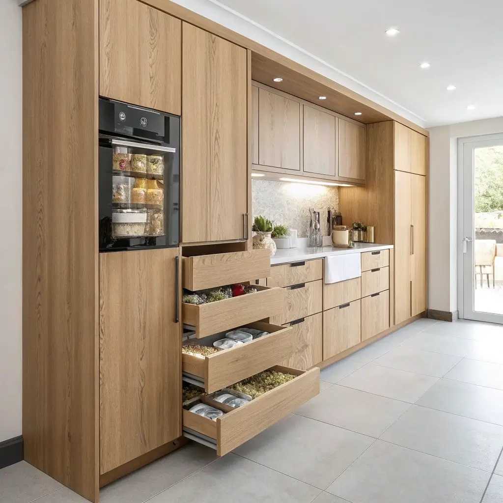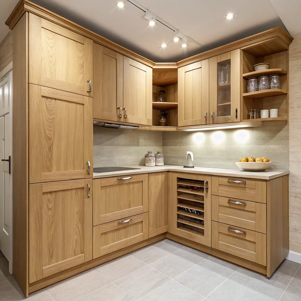 Corners – the Bermuda Triangle of kitchen storage. But corner wooden cupboards with smart design turn these dead zones into storage gold mines. Lazy Susans are just the beginning of what’s possible.