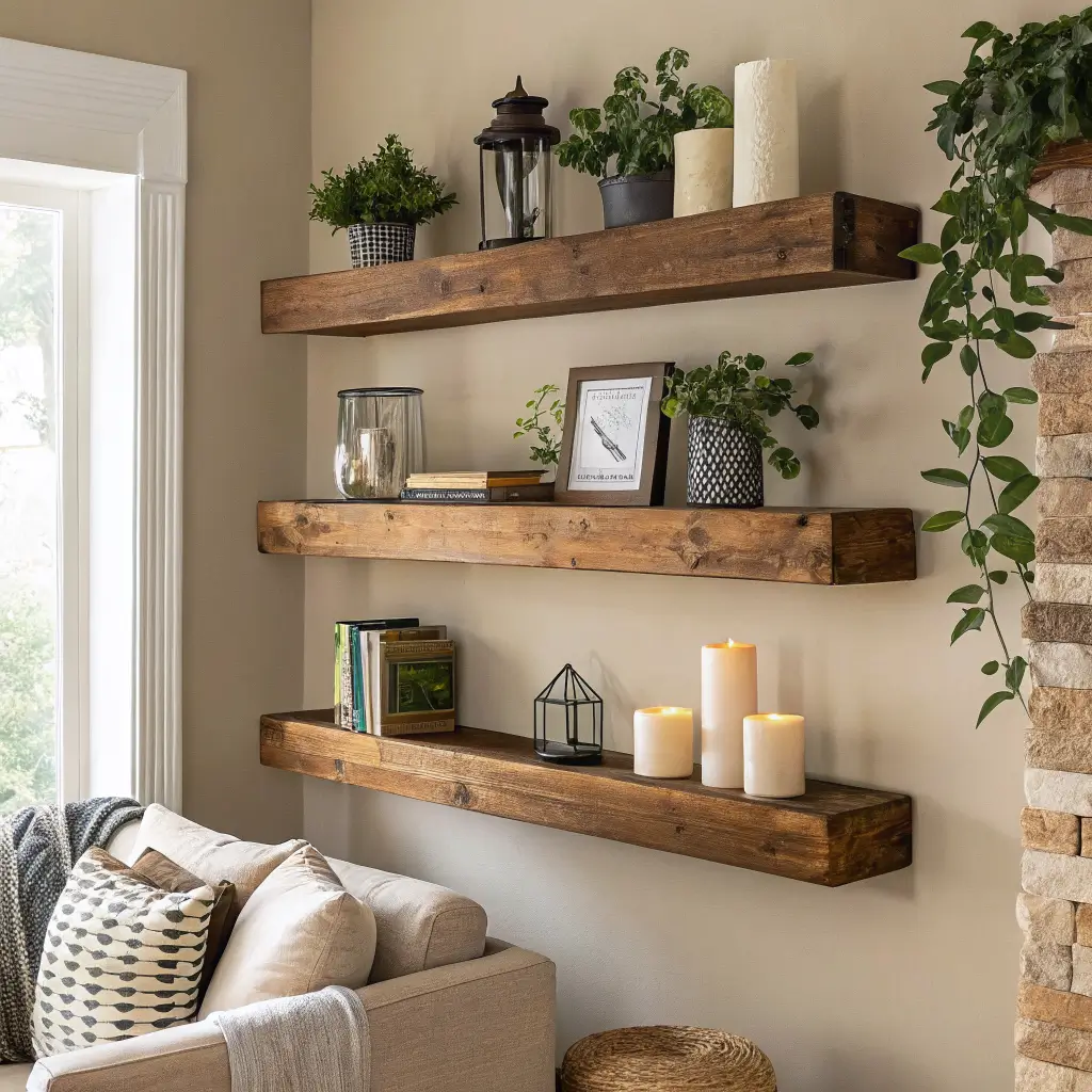 Remember when everyone thought rustic meant “looks like it belongs in a barn”? Those days are long gone, my friend. Rustic floating shelves bring warmth and character without making your living room feel like a farmyard.