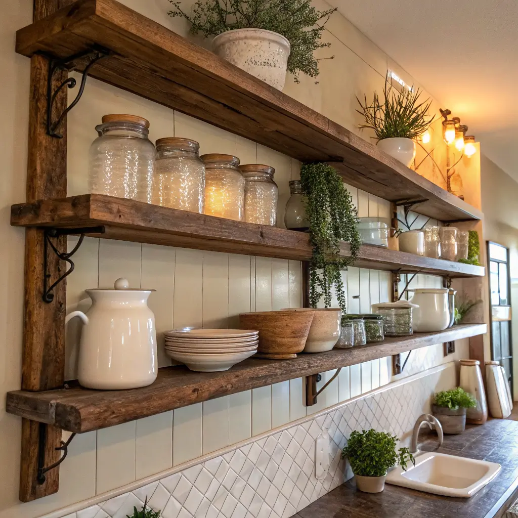 My grandmother’s house had real farmhouse shelves – thick, sturdy planks that could hold anything from her canning jars to heavy ceramic bowls. That’s the vibe we’re after here. Think substantial wood, visible grain, and brackets that mean business.