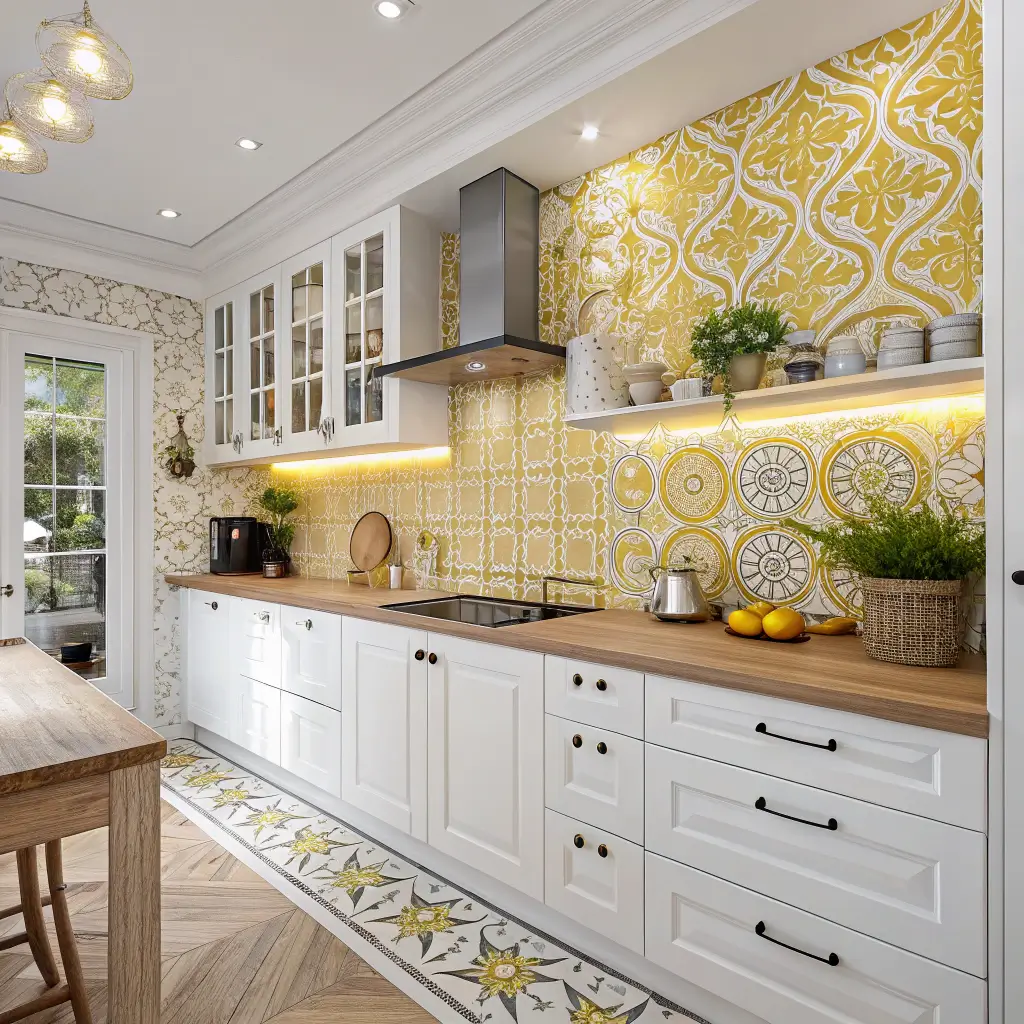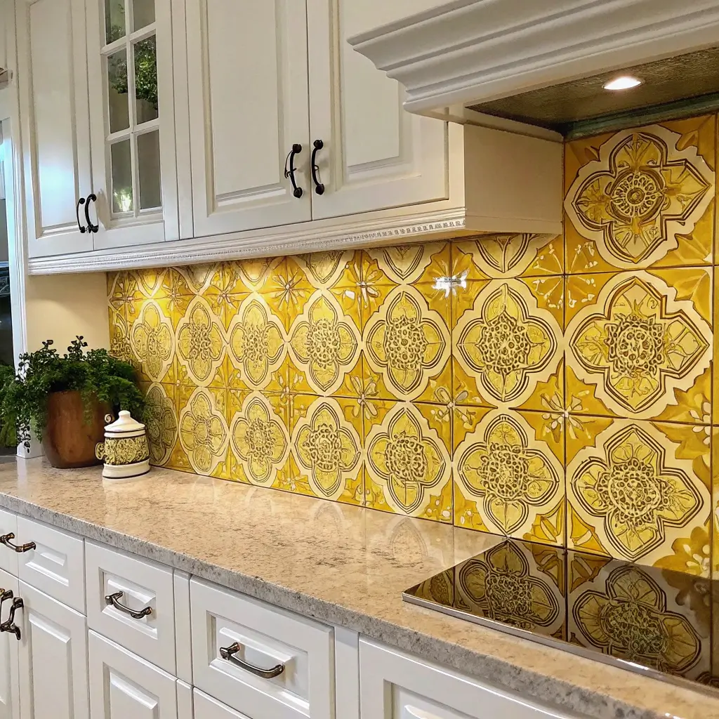 I fell in love with yellow and white patterns after visiting Portugal, where every surface seems decorated with intricate tile designs. You don’t need to fly to Lisbon though – these tiles bring that European charm straight to your kitchen. From simple stripes to complex geometric patterns, the options feel endless.